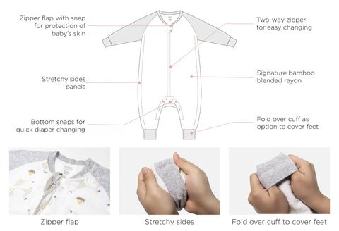 Our long sleeve footed sleep bag (previously called sleep suits) are perfect for the spring and summer weather. Made with our signature bamboo cotton blend. the footed sleep bag is breathable. buttery soft against your baby’s skin. and thermal regulating. Our bamboo is responsibly sourced and an eco-friendly fabric.